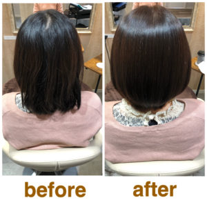 髪の状態に合わせた薬剤、栄養分を使用する事によりダメージは最小限に抑えられ、毛先の広がりは抑えられツヤツヤの綺麗な状態になりました。